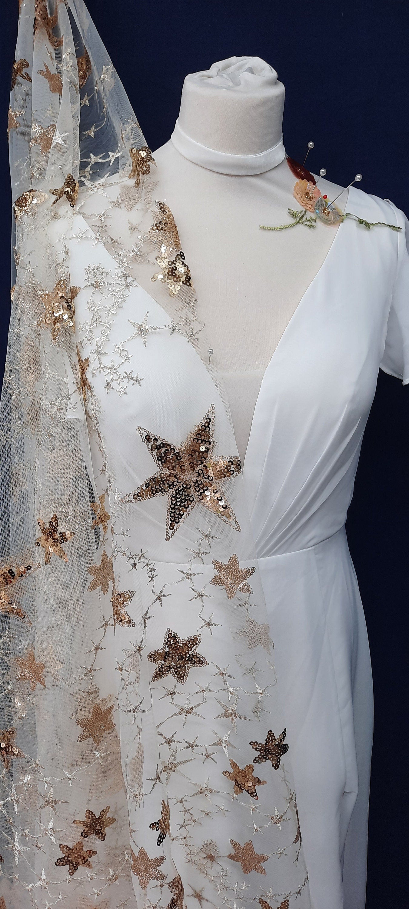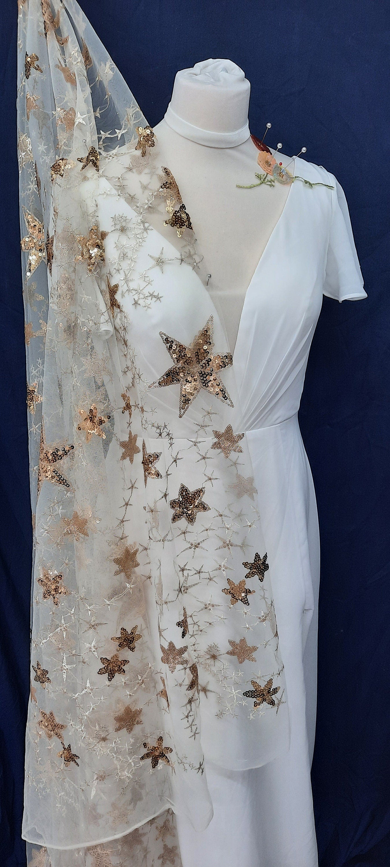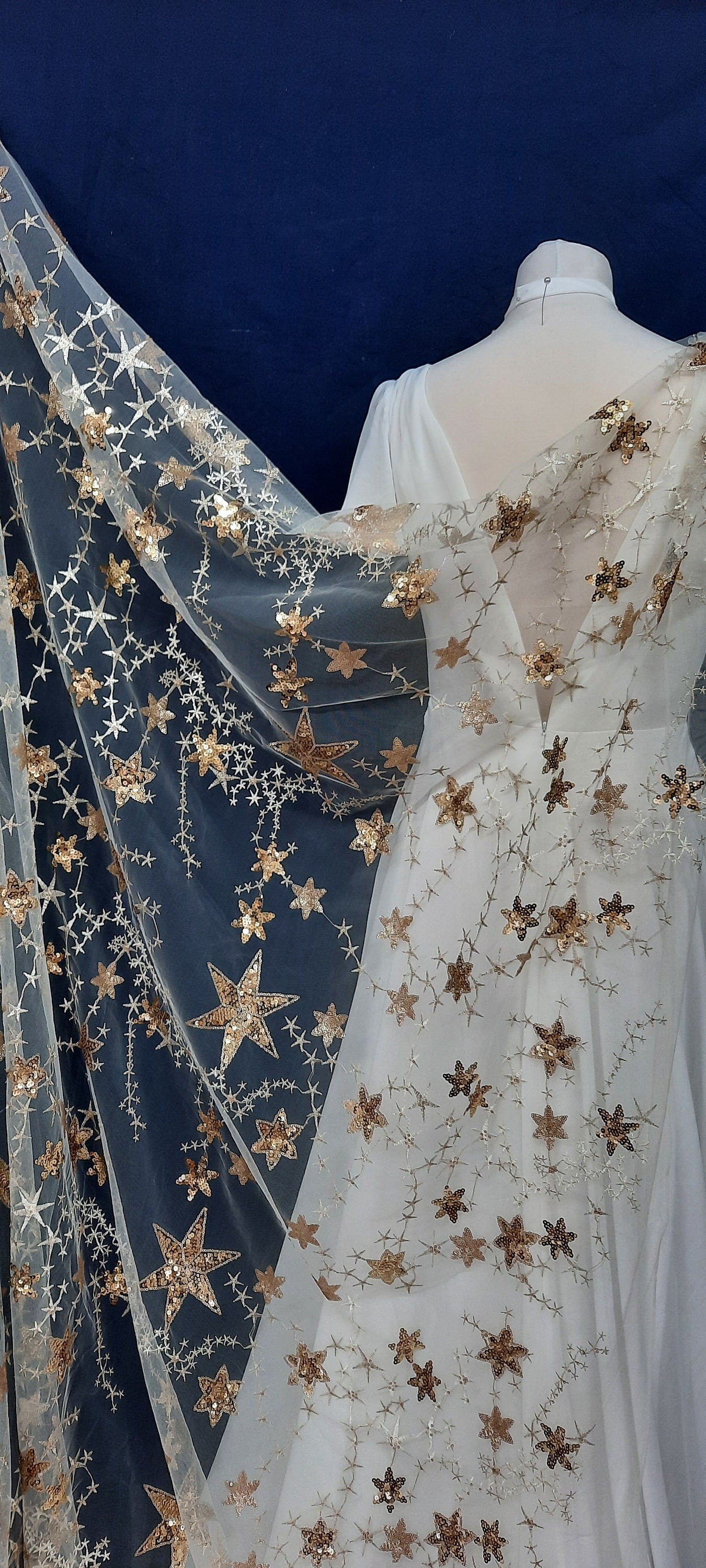 This stunning sequinned veil is perfect for any wedding or celebration. Scattered with embroidered and sparkly stars on golden tulle, it will go with any wedding dress or outfit.