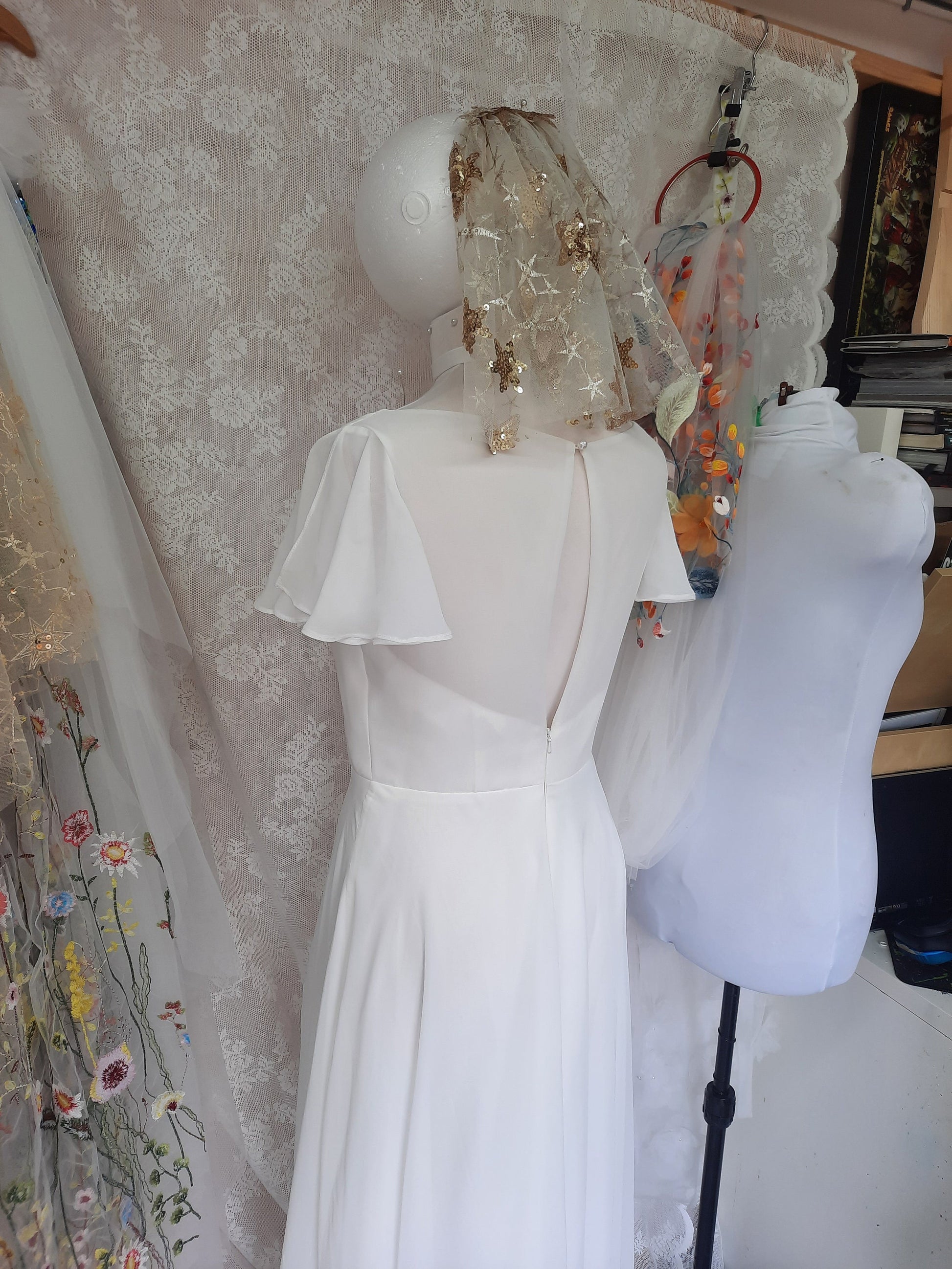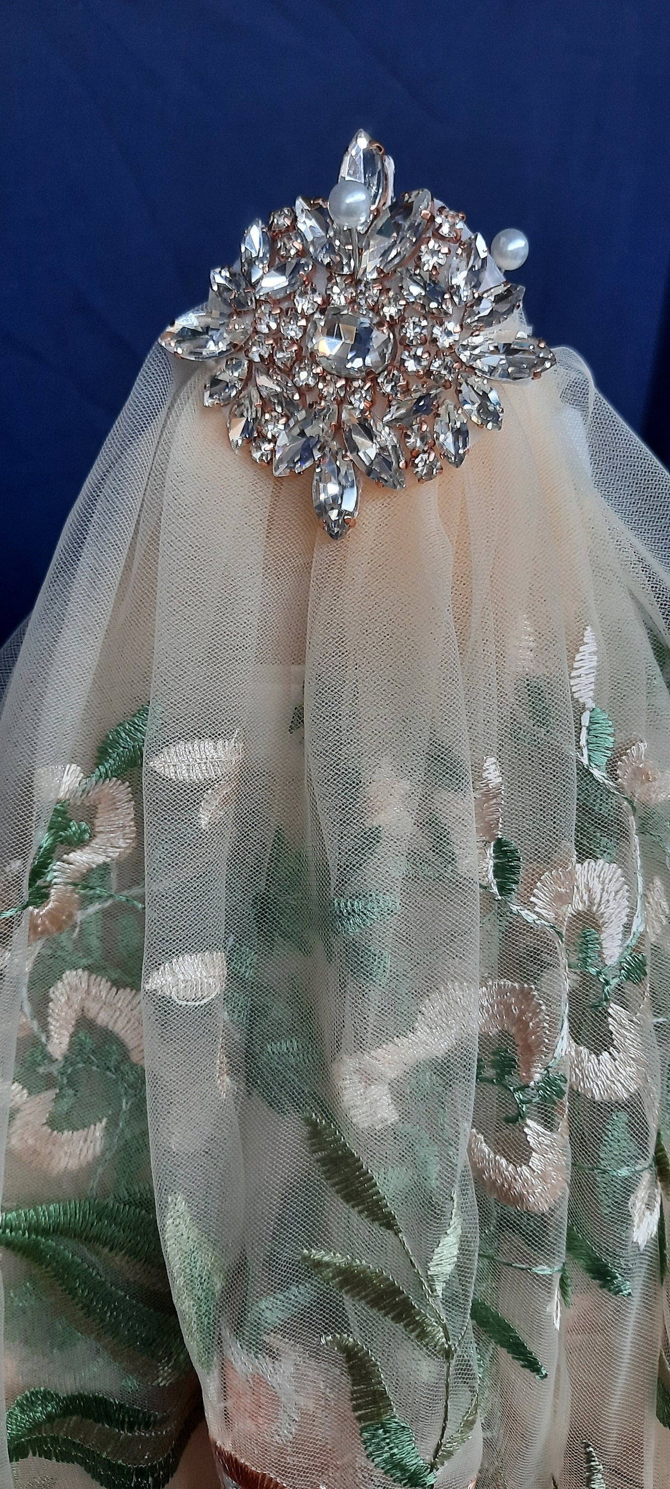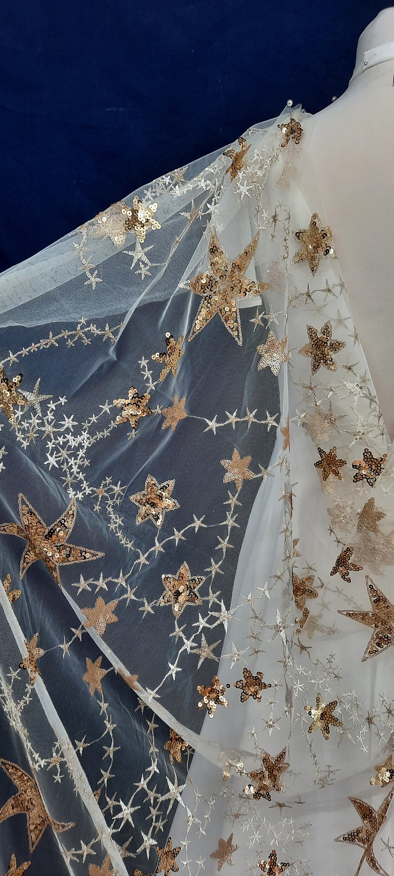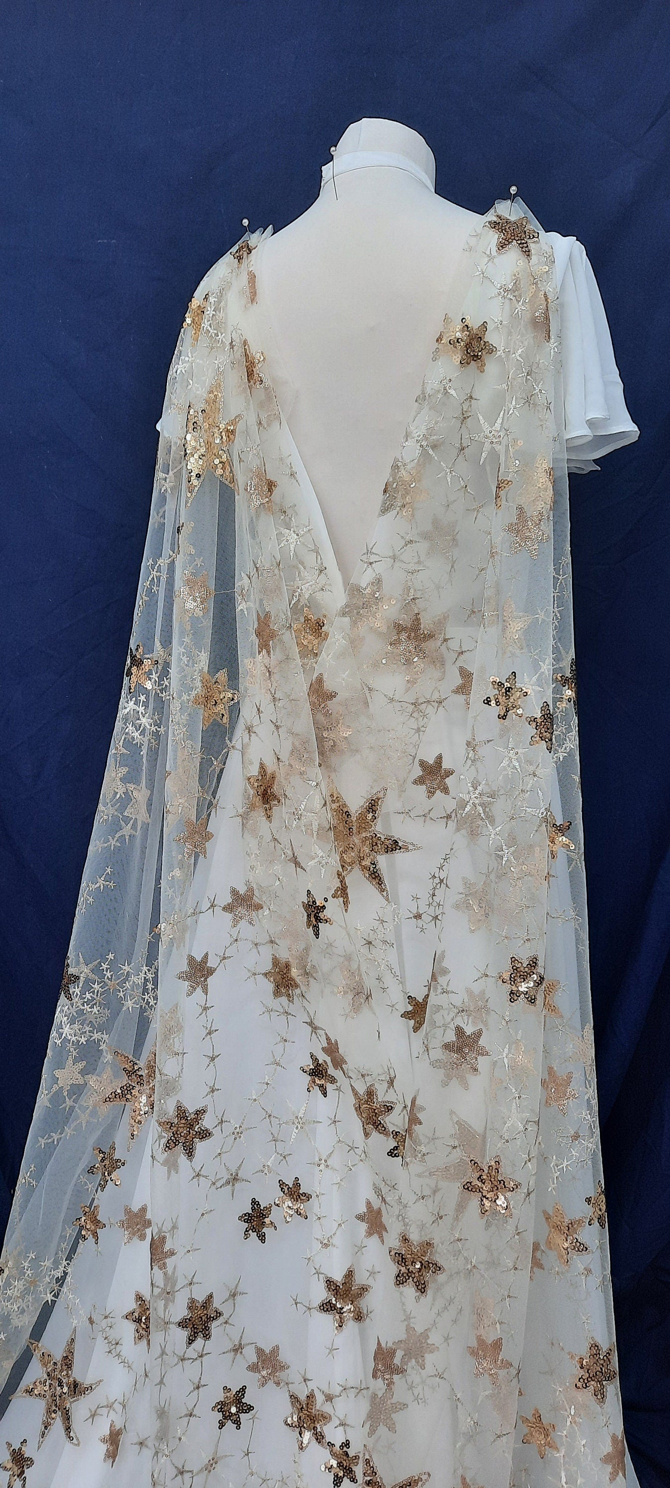 This stunning sequinned veil is perfect for any wedding or celebration. Scattered with embroidered and sparkly stars on golden tulle, it will go with any wedding dress or outfit.